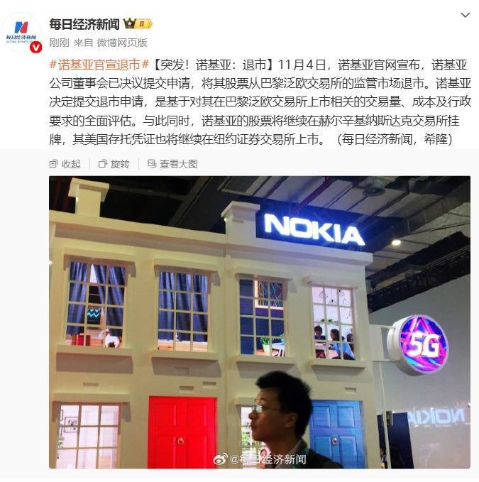 11月4日,诺基亚官网宣布贝贝查,诺基亚公司董事会已决议提交申请,将其股票从巴黎泛欧交易所的监管市场退市。